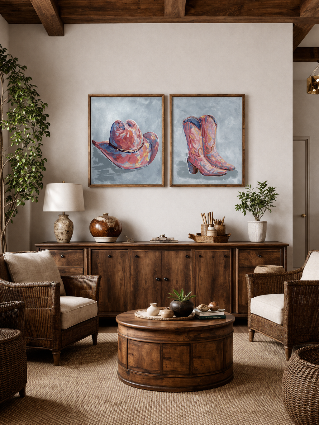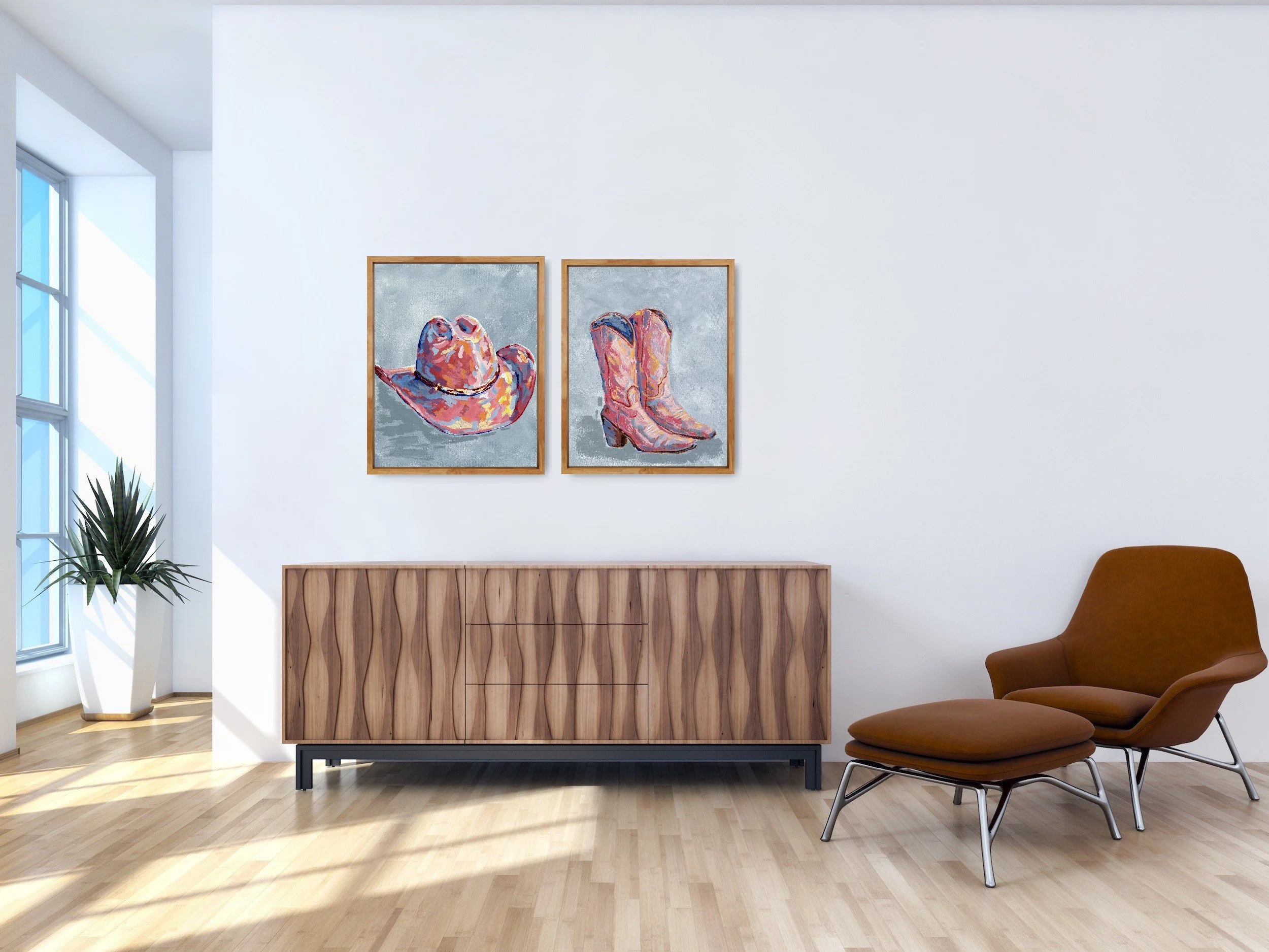 This contemporary cowboy hat and boot art series blends Western iconography with modern abstract painting. Each piece explores the visual language of the American West through expressive color and texture. Collectors of Western art, contemporary abstract art, and modern Americana will find a fresh perspective in these works. Original paintings and limited edition prints are available, offering art collectors a unique way to engage with evolving interpretations of Western heritage and symbolism.