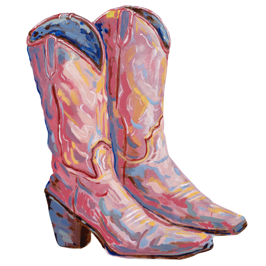 In this series, the hat and boots shift from traditional colors to feminine pinks and queer multicolored fields that gently question who gets to belong inside these familiar symbols.